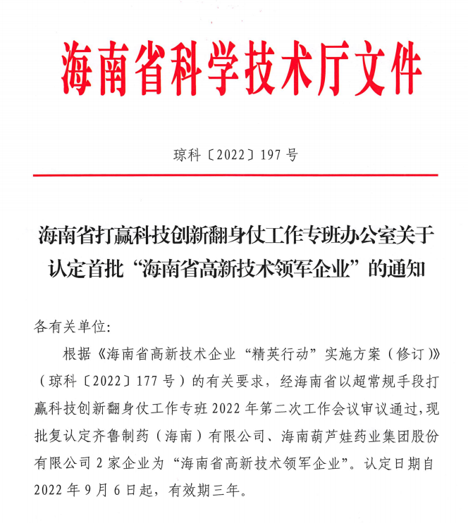 近日,海南省科学技术厅发布的《海南省打赢科技创新翻身仗工作专班办公室关于认定首批“海南省高新技术领军企业”的通知》中显示,批复认定海南尊龙时凯药业集团股份有限公司等2家企业为“海南省高新技术领军企业”。认定日期自2022年9月6日起,有效期三年。